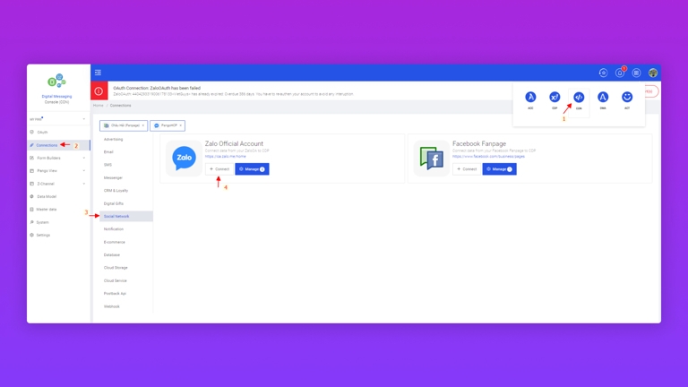 Chọn Connections / Social Network / Zalo Official Account / Manage / OA Followers