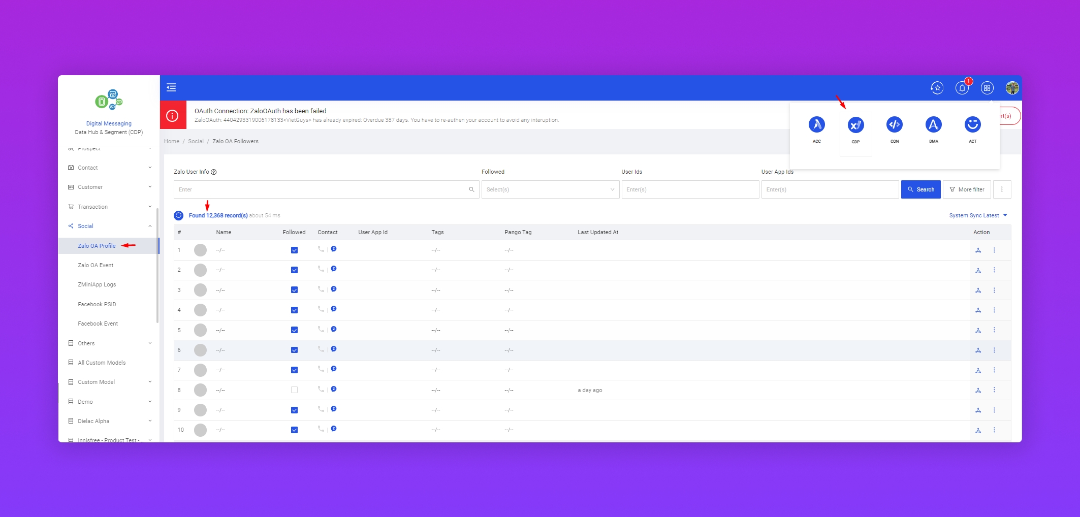 Bước 1: Sync dữ liệu từ Zalo OA vào PangoCDP