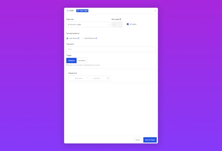 Range Time: số lượng dữ liệu Zalo OA được sync tương ứng với khung thời gian được chọn