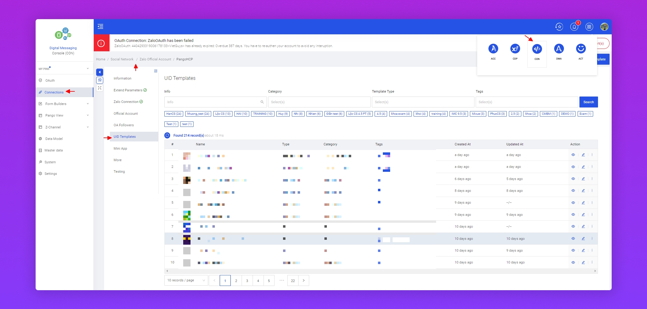 Chọn Connections / Social Network / Zalo Official Account / Manage