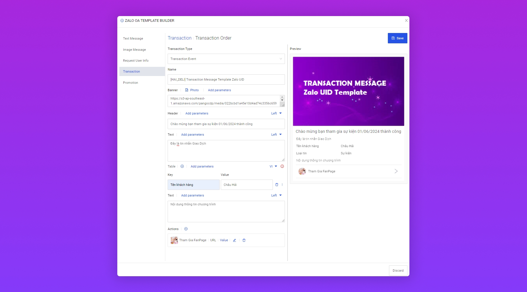 Tài liệu hướng dẫn bạn thao tác thiết kế tin Giao Dịch, loại tin nhắn Zalo UID trên PangoCDP.
