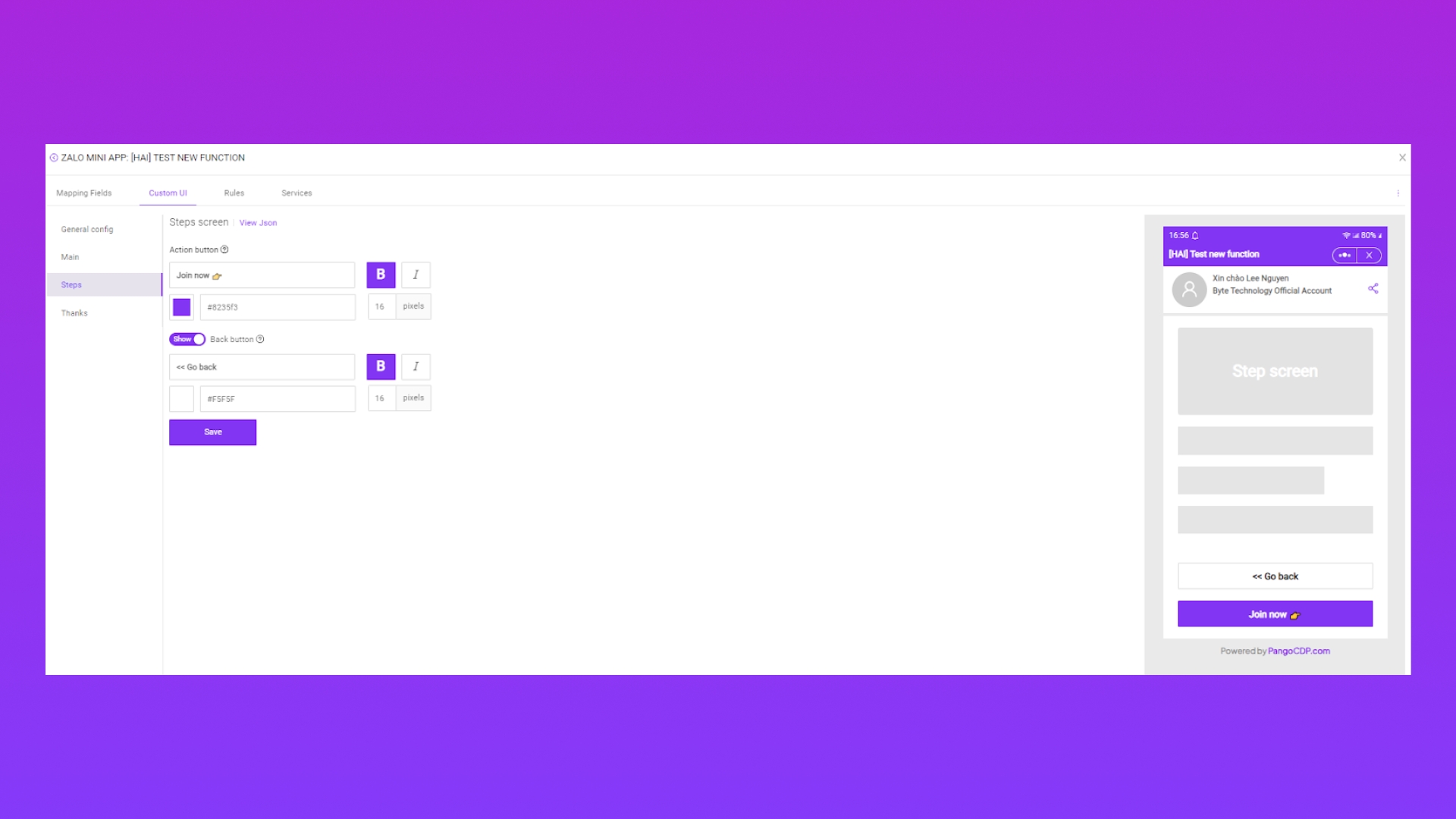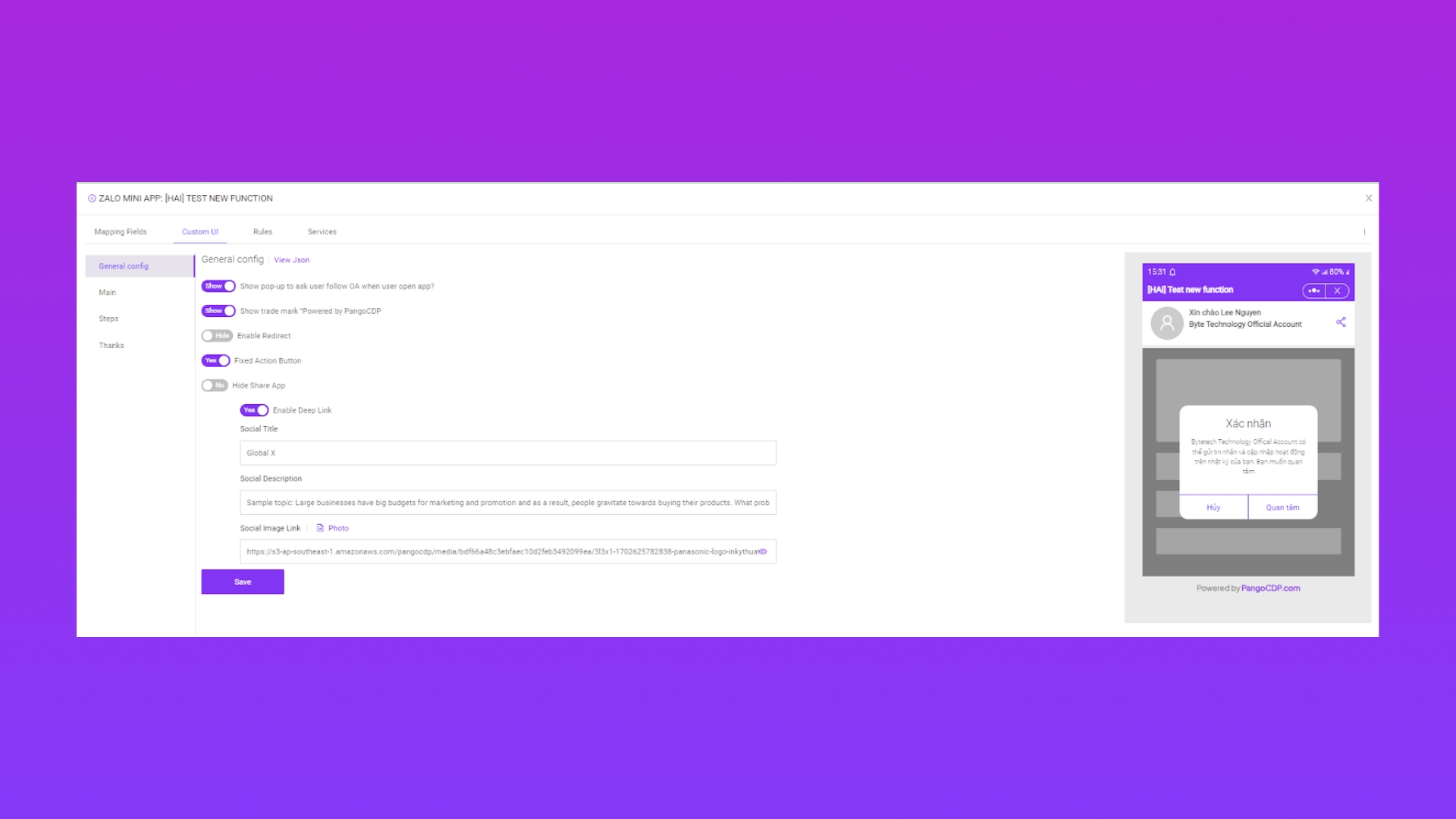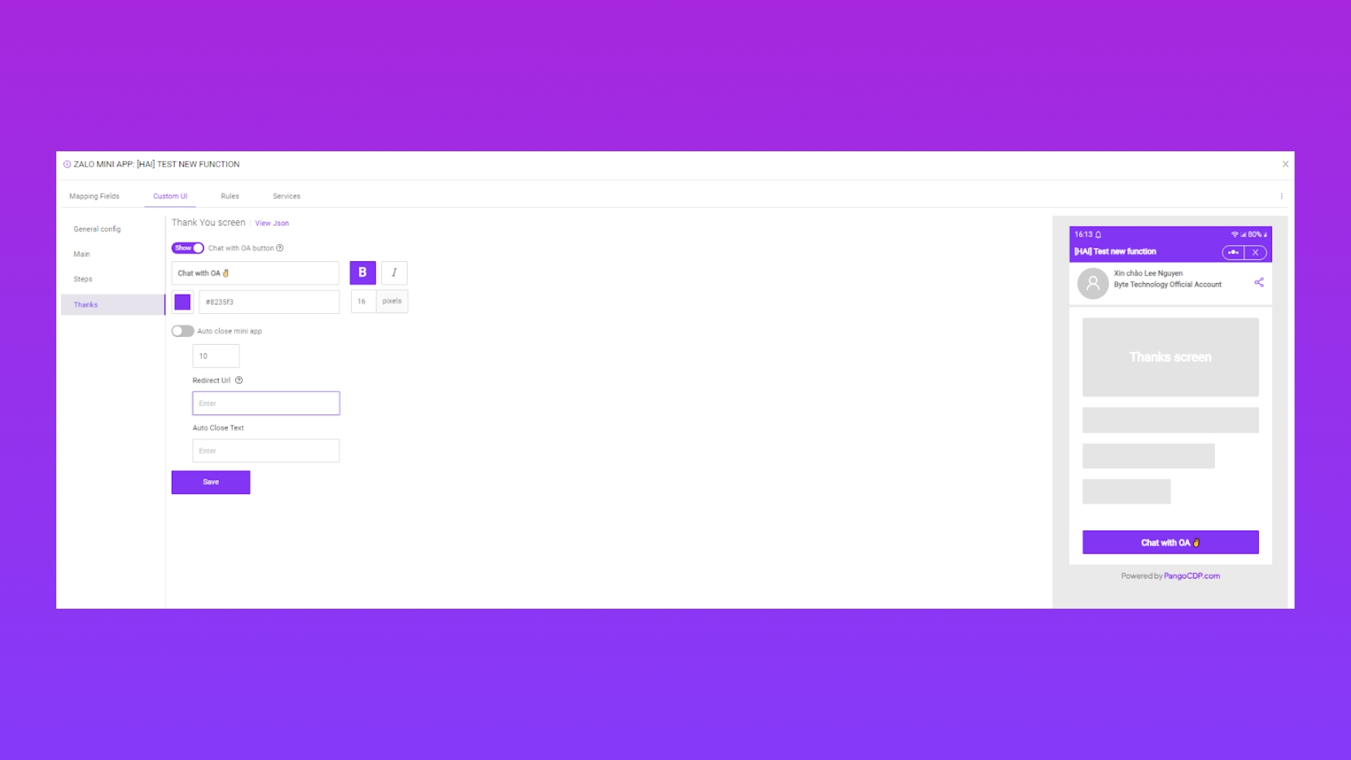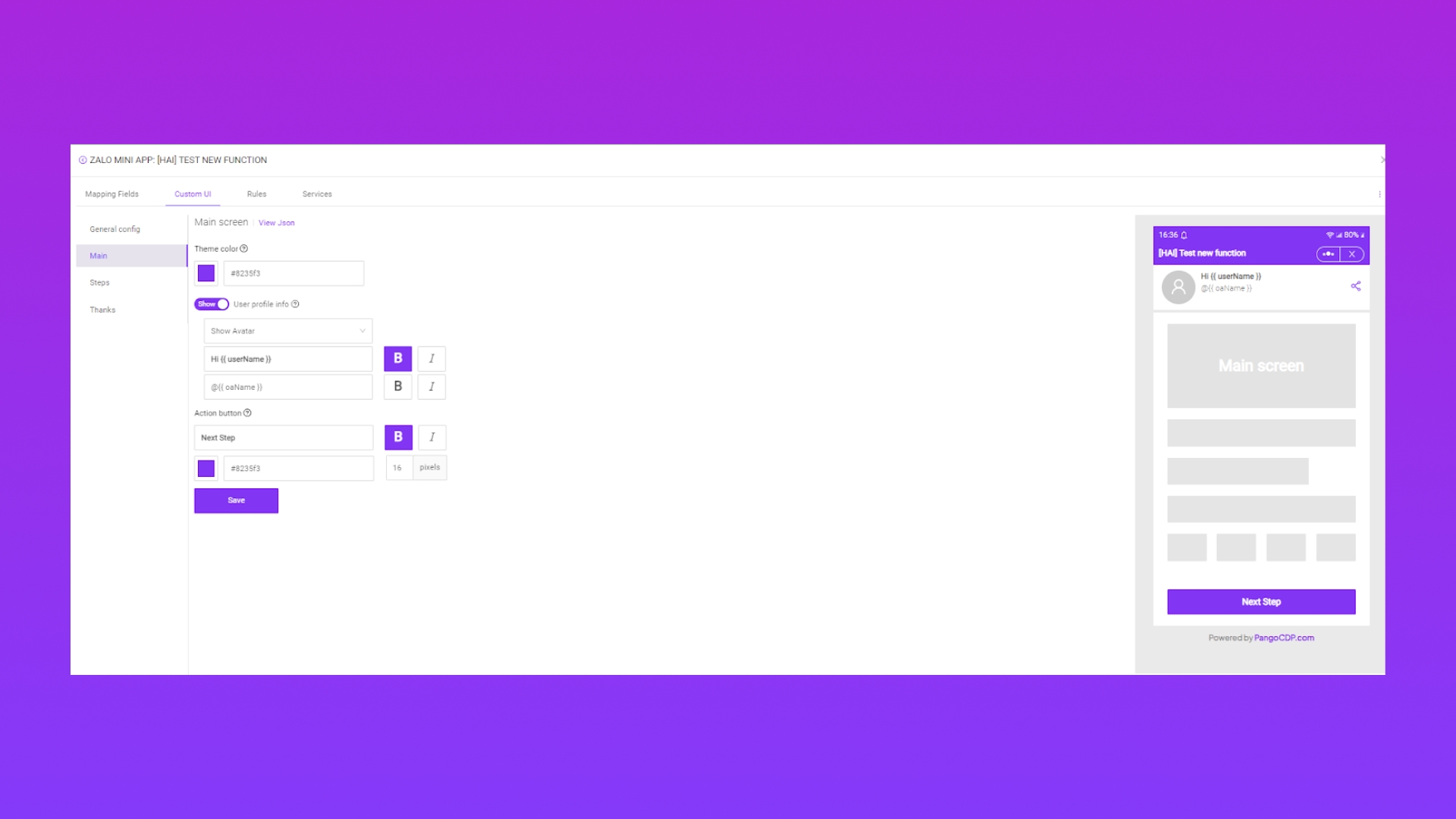 Tài liệu hướng dẫn bạn thao tác thiết lập CustomUI trên Zalo Mini App của PangoCDP.