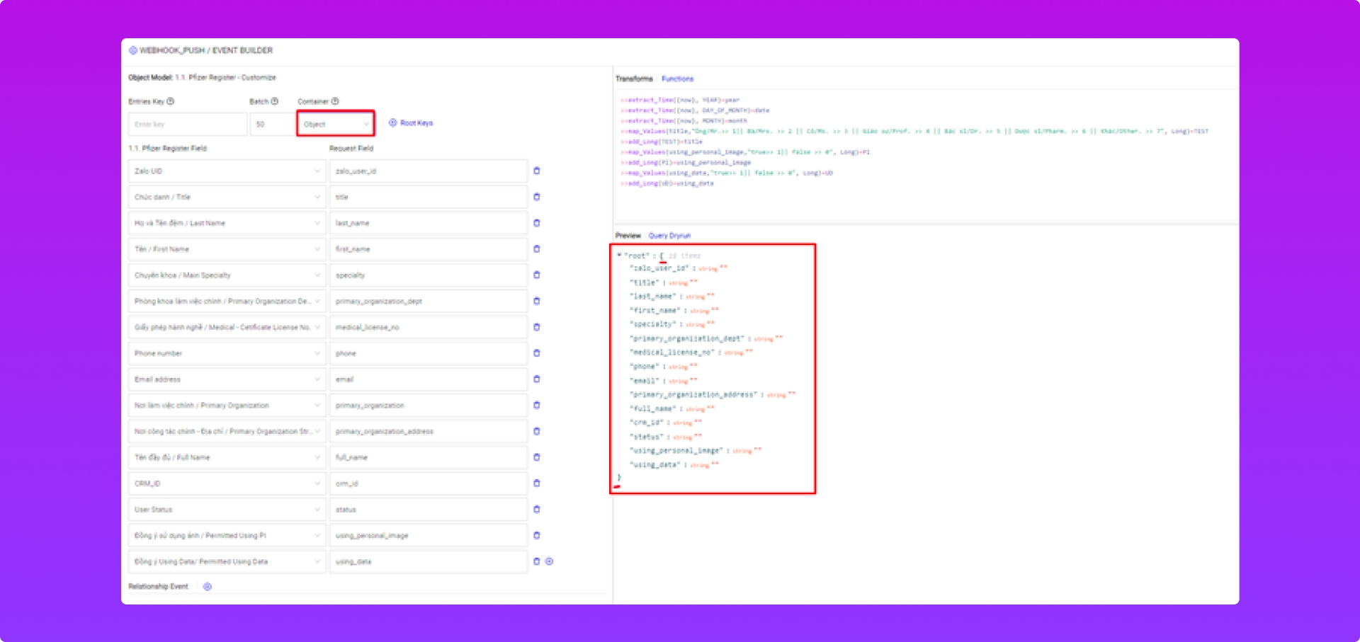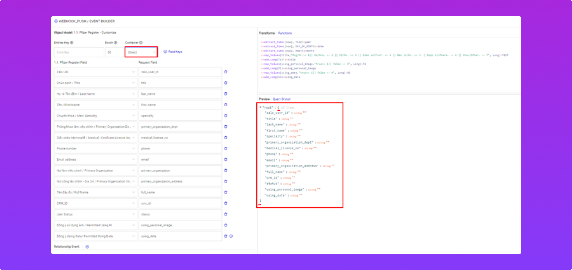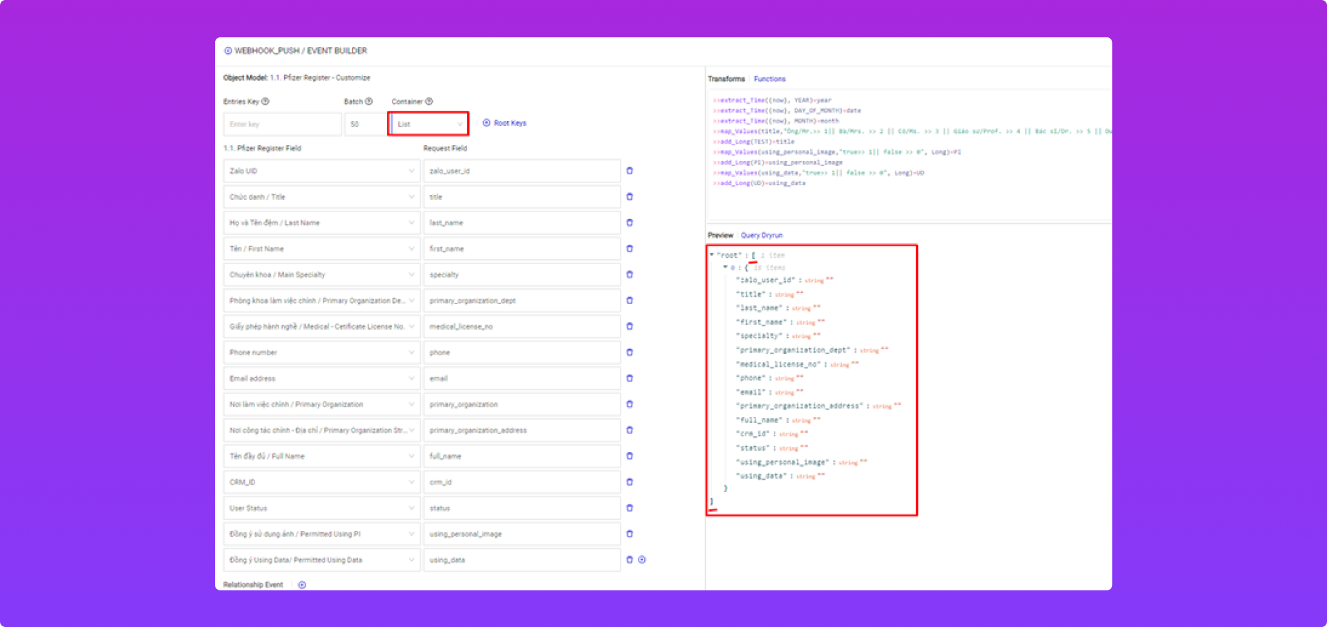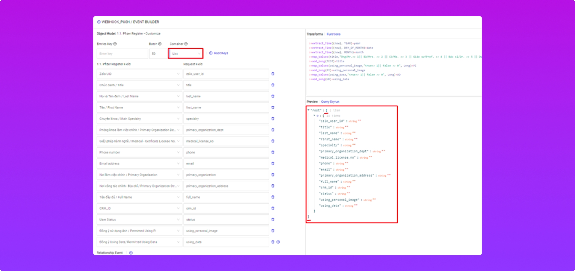 Dùng để xem trước dạng dữ liệu được push sang khách qua Webhook.
