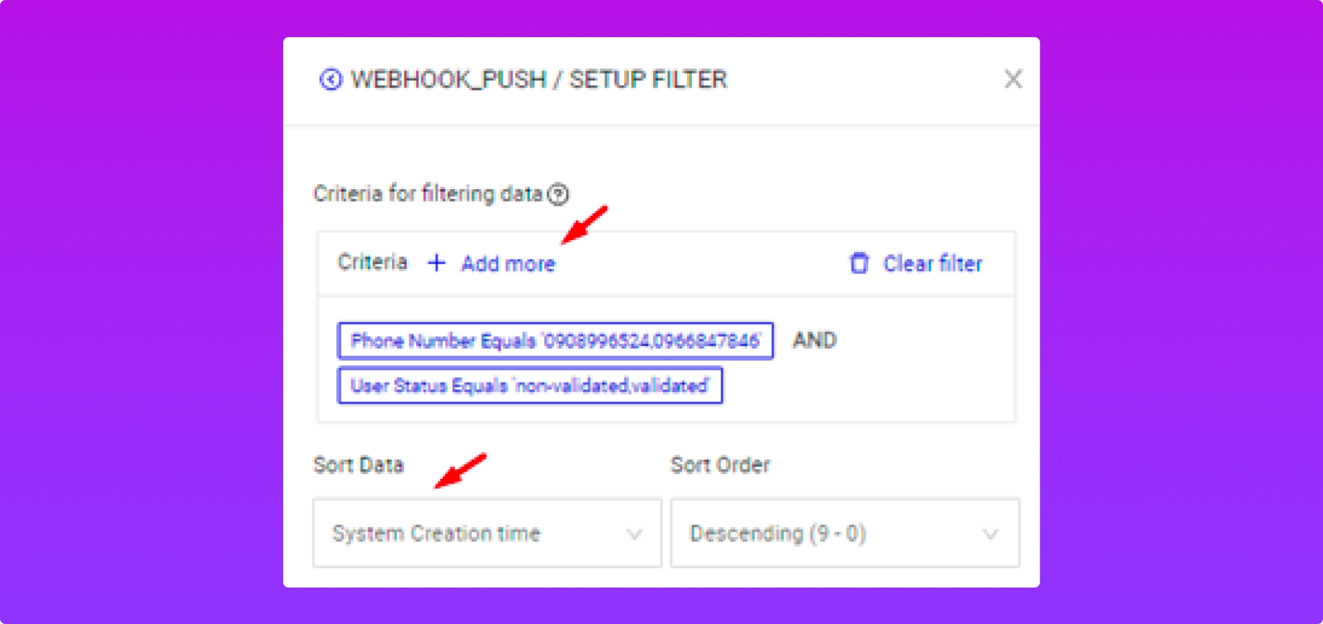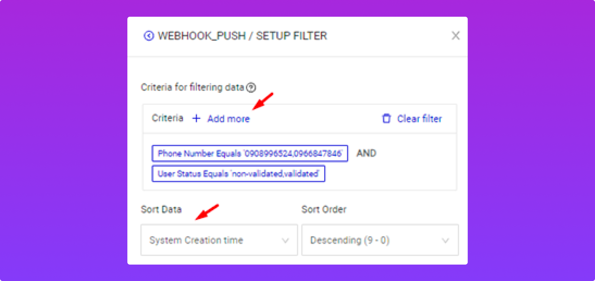 Ngoài ra, mình còn có thể thiết lập thêm các điều kiện cho Event_Webhook trước push dữ liệu như sau: