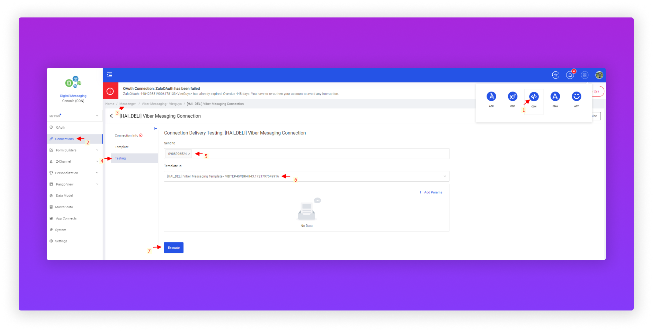 * Vào [Module Console](https://console.mydatalakes.com/connections/Messenger_VietguysViberMessaging/66a07e003ffc700001d0cd18?tab=dtest)
