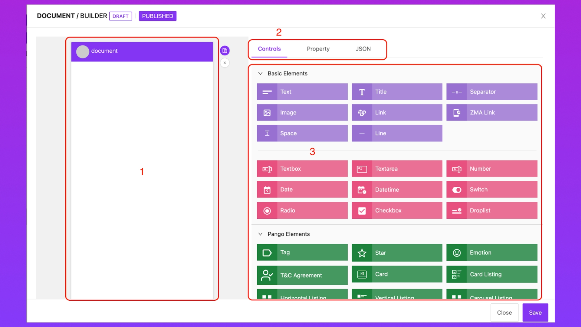 Có 3 function: - Control: Danh sách các element - Property: Chỉnh sửa, custom các đặc tính trong element (hiển thị, giá trị, UI,...) - Json: Xem cấu trúc json của từng element