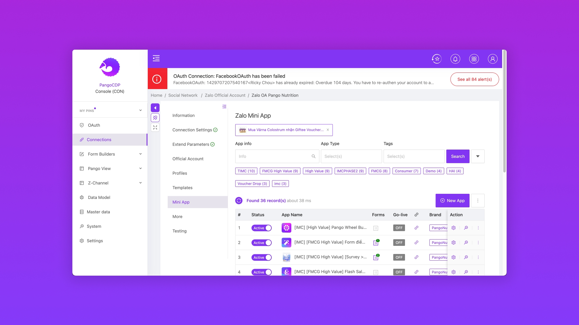 Truy cập module Console -> Connections -> Mini App -> click New App