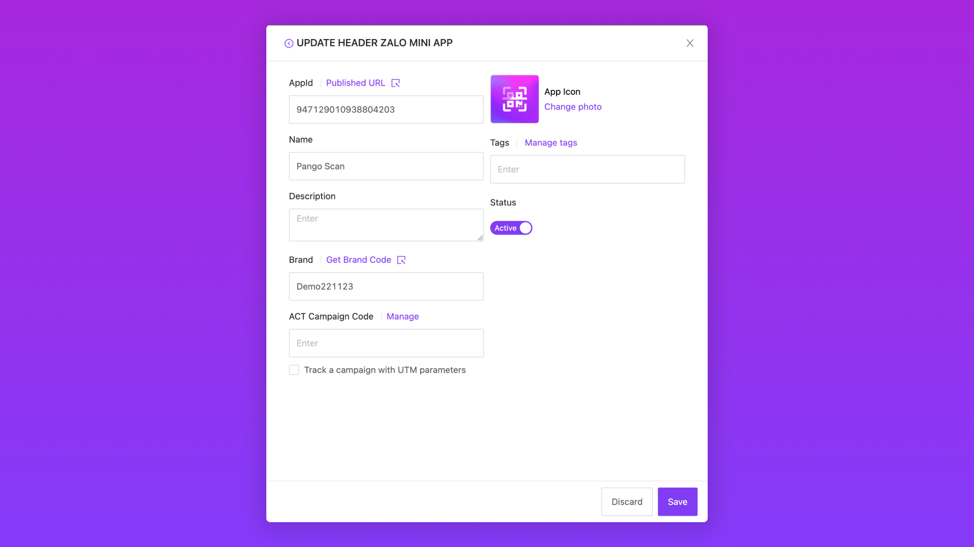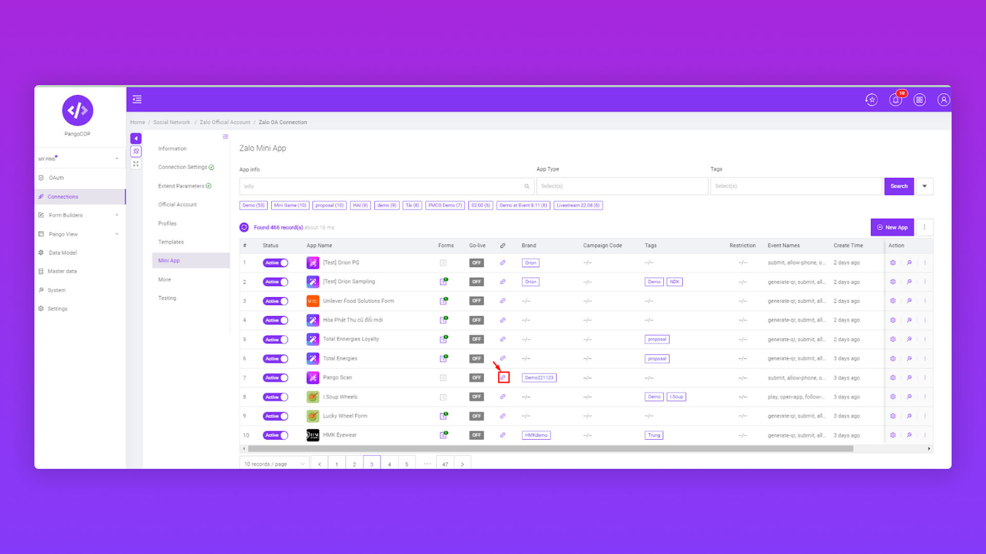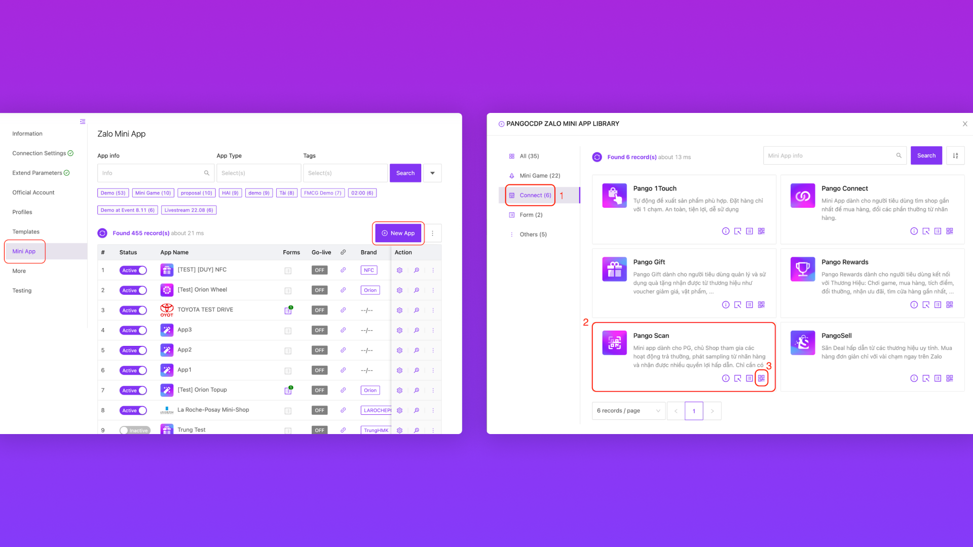 Bước 2: Chọn Mini App → New App → Connect → Pango Scan