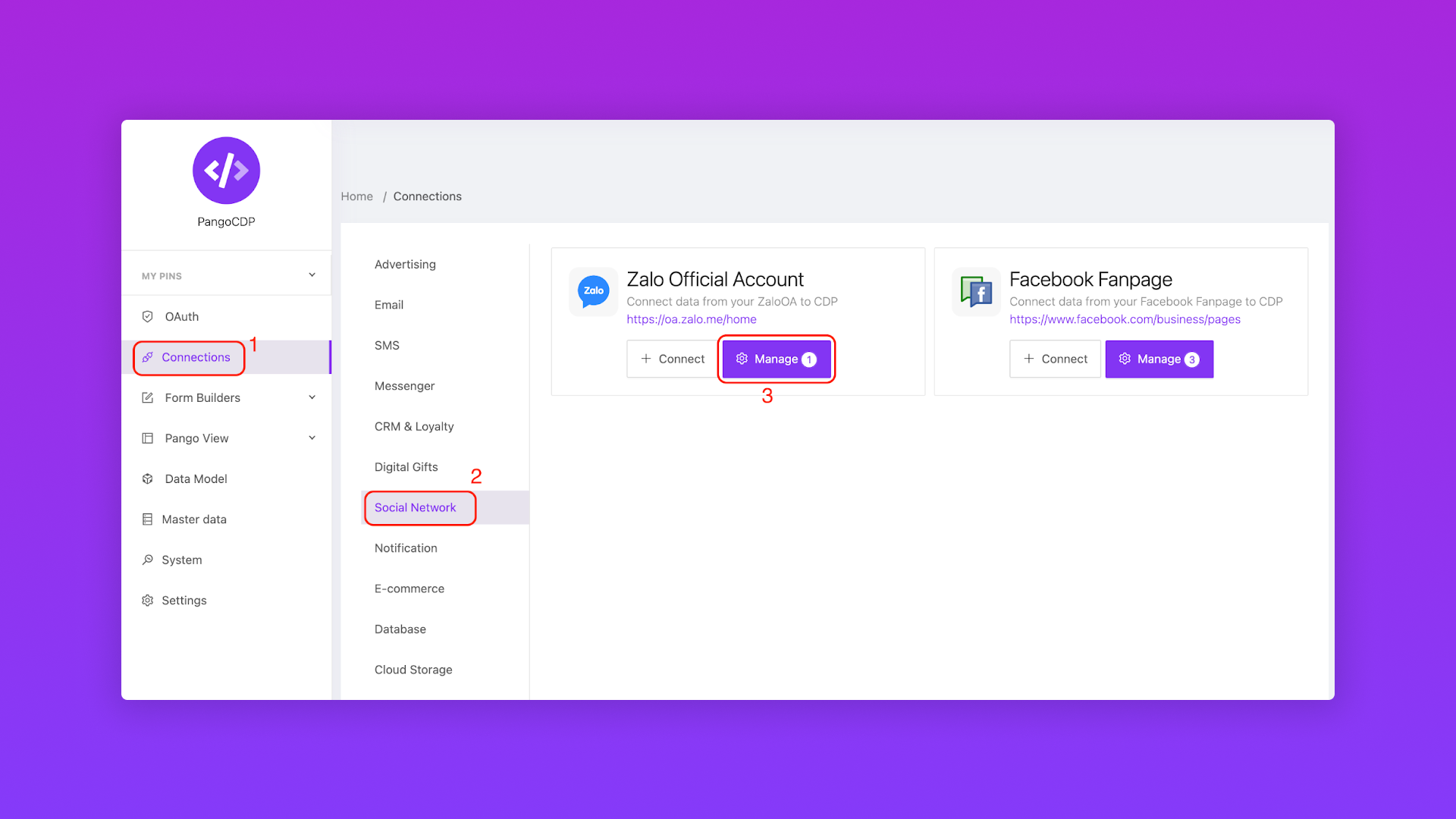 Bước 1: Module Console → Connections → Social Network → Manage → Chọn Zalo OA Connection